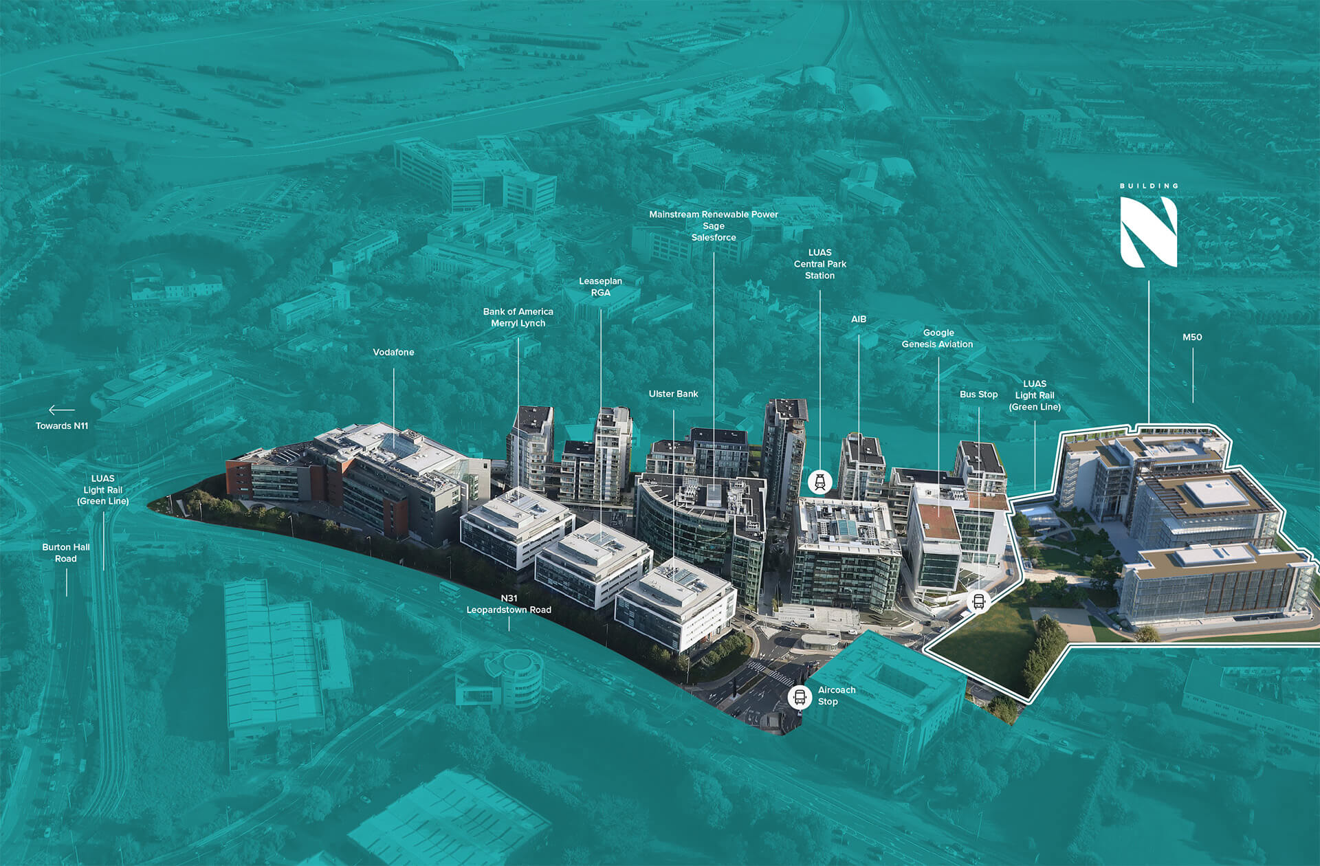 The Building N development will deliver a further 514,239 sq.ft of Grade A office accommodation to the more than 1 million sq.ft in existence at Dublin’s Central Park in Leopardstown. The site is located at the South end of the Campus, adjacent to the M50 motorway and close to the Campus’ dedicated Luas Light Rail stop. Central Park is 10km away from Dublin City Centre, situated at the foothills of the Dublin Mountains and is home to leading national and international businesses including Salesforce, Vodafone, Google, Ulster Bank, Bank of America Merryll Lynch and AIB.